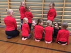 Helsingin Jyryn Tanssin ja Voimistelun 7-8-vuotiaat uusissa treenitakeissaan. Jumppakärpänen pörrää innoissaan! Lasten Liikkis-ryhmä Kalasatamassa sekä joukkuevoimistelun/ rytmisen alkeisryhmämme 7-8 -vuotiaille ovat täynnä.